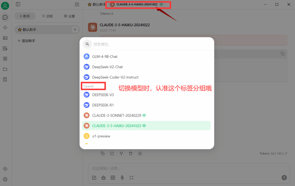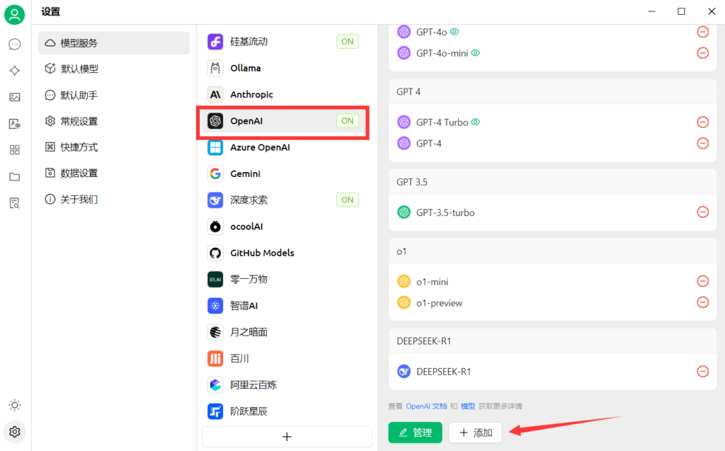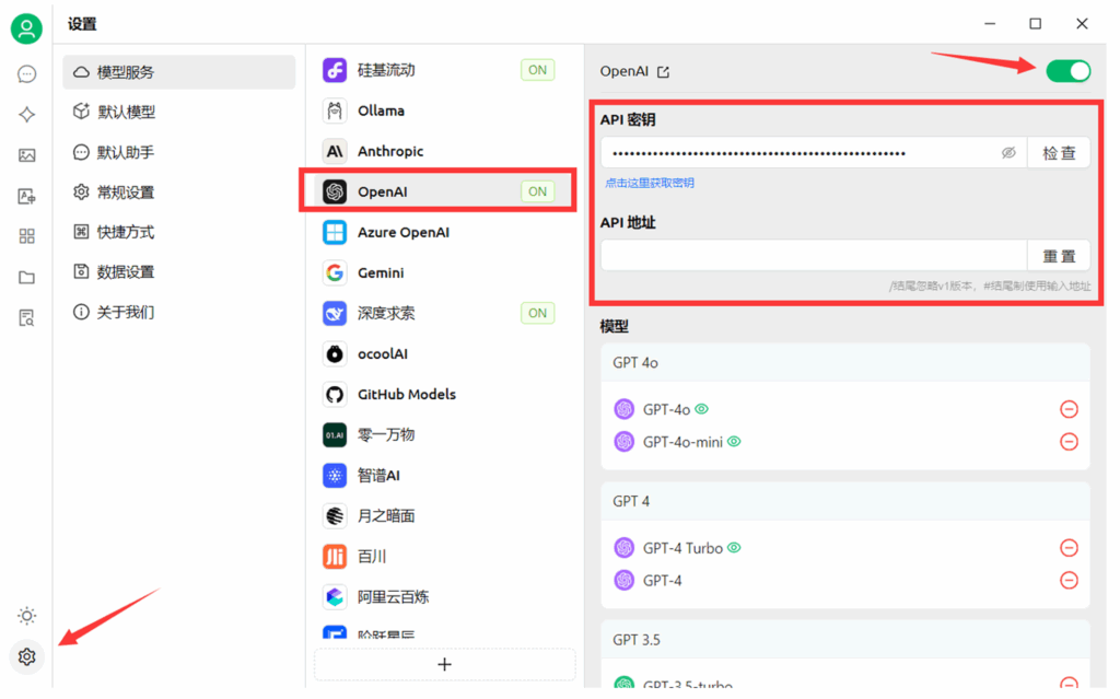 1.左下角设置→OpenAI(因为我们服务器走的是open依赖库)→填写key和对应地址