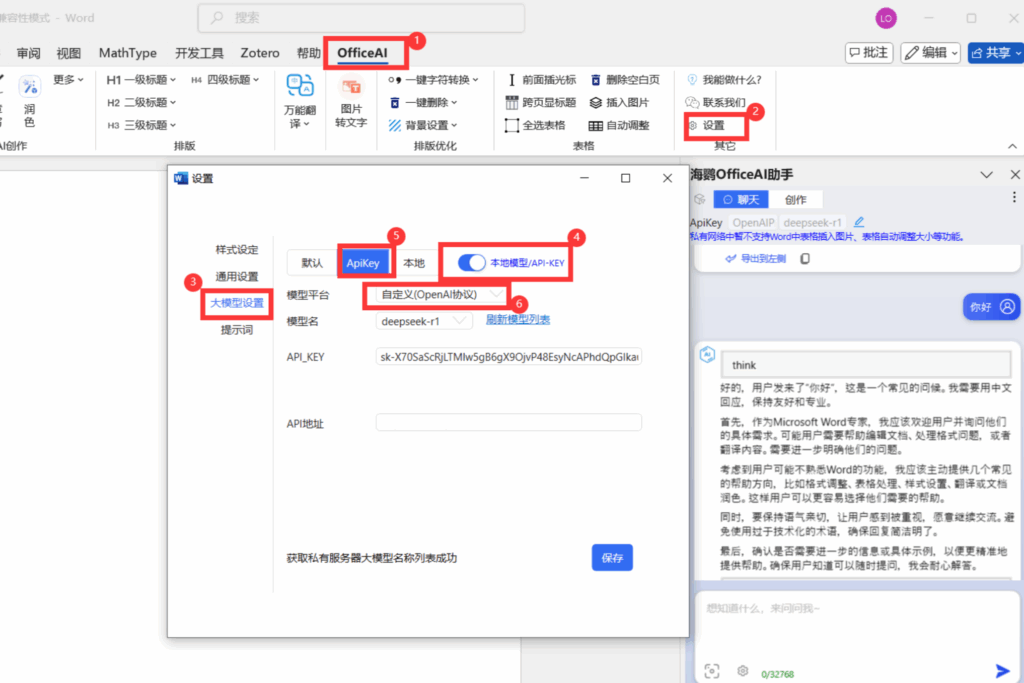 点大模型设置→自定义(openai协议)→填写key→填写API地址