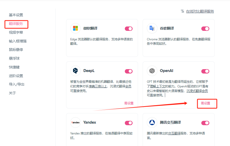 1. 选择翻译服务,在OpenAI 下点击 需设置